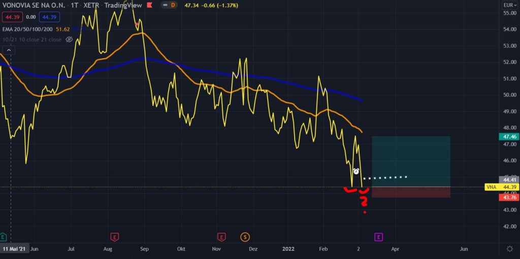 Den Stop setzen wir idealerweise bei 43,75 Euro, so dass man mit leichtem Verlust verkauft, sollte sich der Kurs weiter nach unten fortsetzen. Dadurch hätte man ein gutes Chancen-Risiko-Verhältnis.