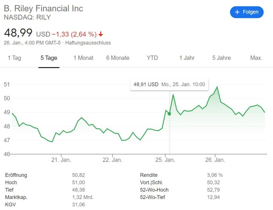 Der Aktienkurs von B. Riley hat sich in den letzten drei Monaten seit 25. Oktober 2020 von rund 25 Dollar auf jetzt fast 50 Dollar verdoppelt und ist jetzt leicht unter Allzeit-Hoch (52,79)