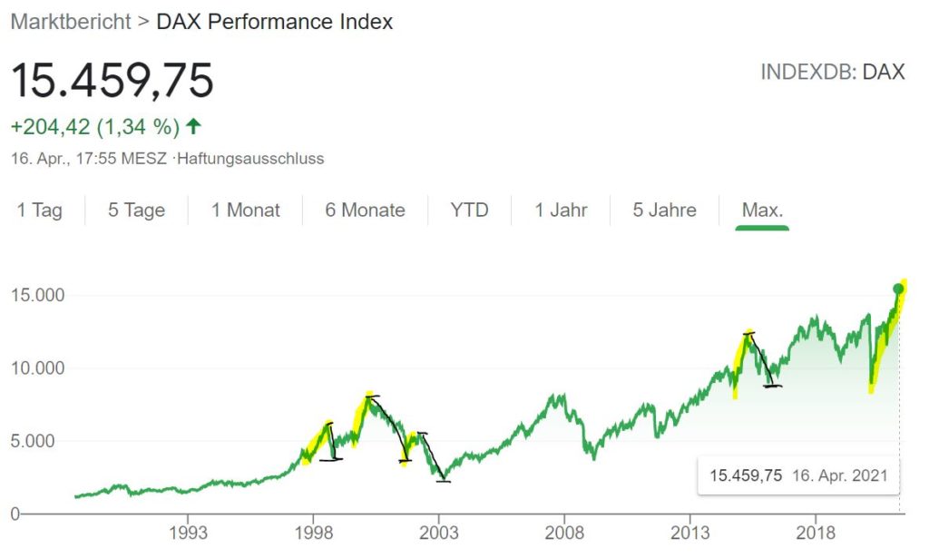 Diese Grafik zeigt den DAX-Kursverlauf in den letzten 20 Jahren. Immer, wenn es in kurzer Zeit ein explosives Wachstum nach oben gab, folgte ein harter Absturz. Und so einen starken Anstieg wie zwischen März 2020 und April 2021 gab es noch nie!